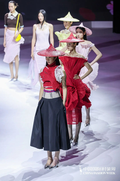 T台上,模特们身着改良版惠安女服饰缓步走来。黄斗笠轻覆薄纱,含蓄中透出神秘;花头巾化作流云印花,点缀于飘逸缎面之间;短上衣与宽筒裤通过立体剪裁与不对称设计,既保留了传统韵味,又展现出当代审美。就连传统银腰带也蜕变为精致的金属饰件,在灯光下勾勒出“柔中带刚”的惠女风骨……每一处细节都蕴藏着山海的灵气,一针一线都诉说着创新的力量。